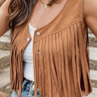 This sleeveless jacket features elegant fringes and refined button details. Its timeless design suits various occasions. Perfect for layering over your favorite outfits.