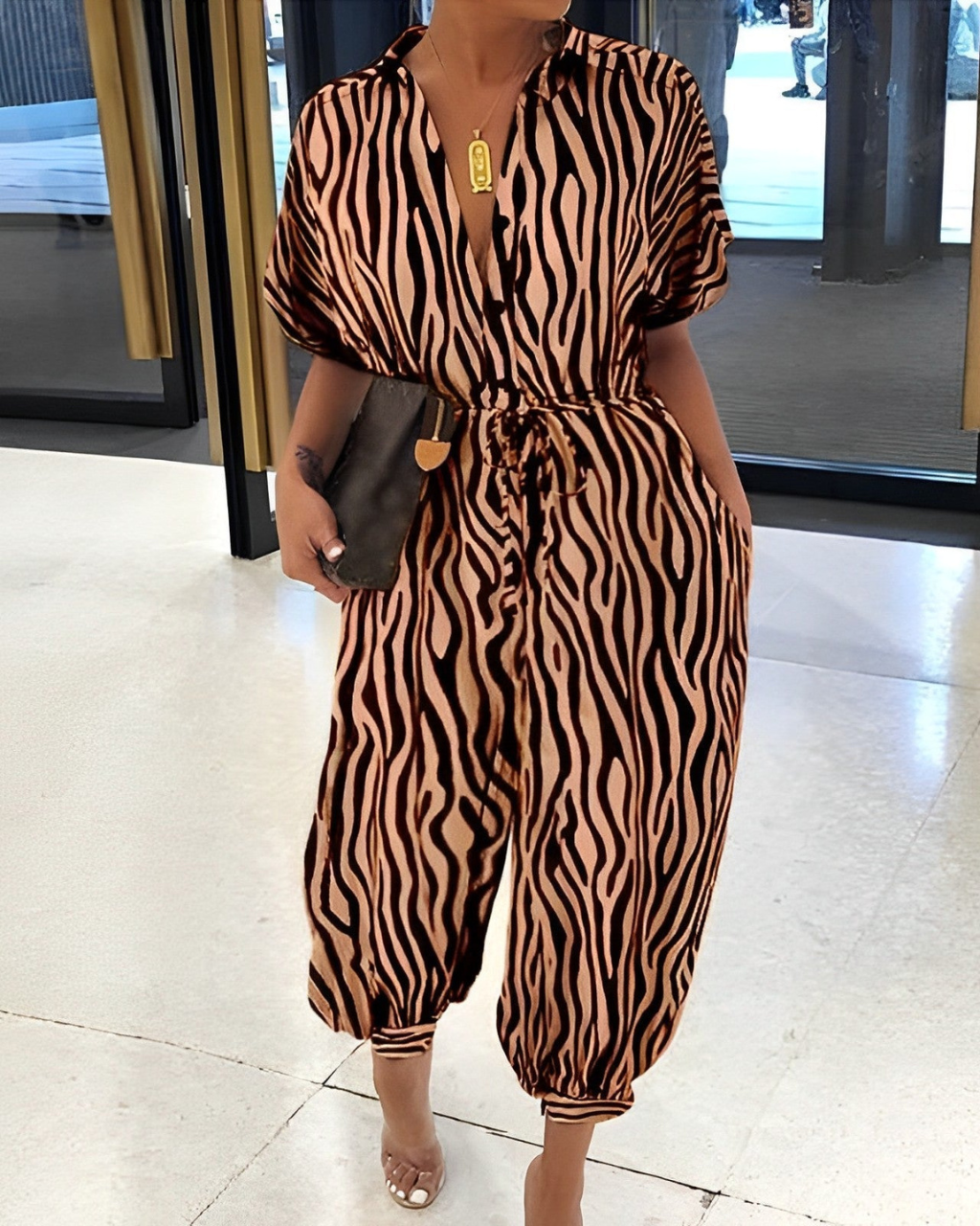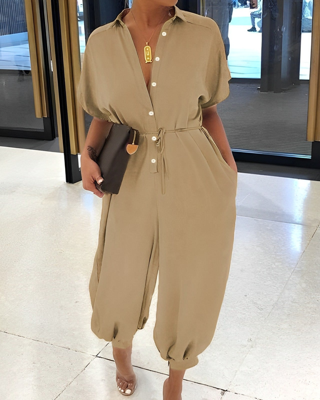 Cette combinaison ceinturée offre un style moderne et une coupe confortable. Son design boutonné et ses jambes resserrées apportent une touche tendance, idéale pour vos sorties ou journées décontractées.