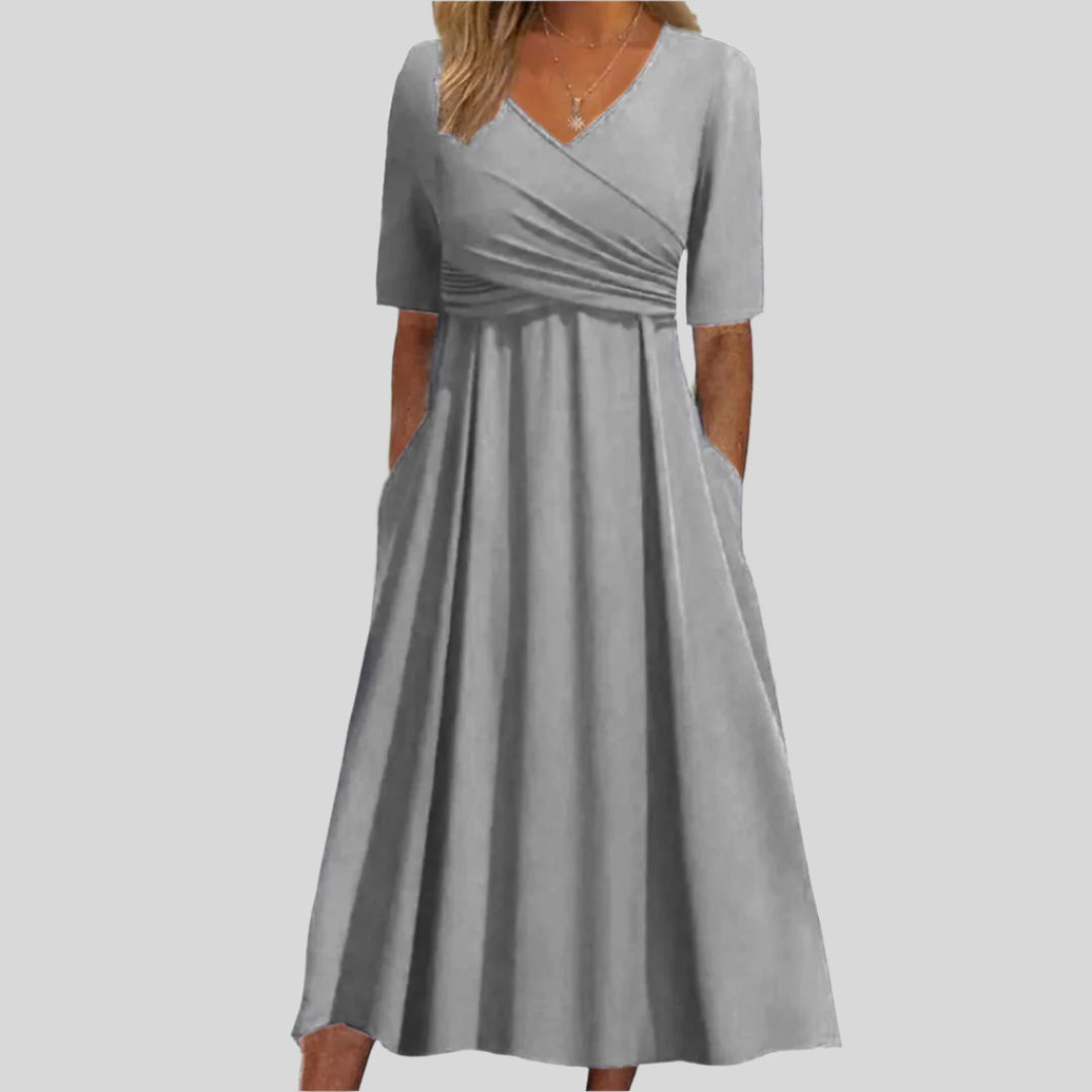 שמלת מקסי זו עם שרוולים קצרים מציעה סילואט מחמיא. העיצוב האלגנטי שלה מתאים למגוון הזדמנויות. זמינה בכמה צבעים כדי להתאים לסגנון שלך.