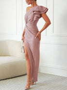 השמלה הארוכה הזו מציגה גזרה זורמת עם כתף חשופה. השכבות והחריצים הצדדיים מוסיפים נופך של sophistication. מושלם לחתונות, ערבים ואירועים רשמיים אחרים.