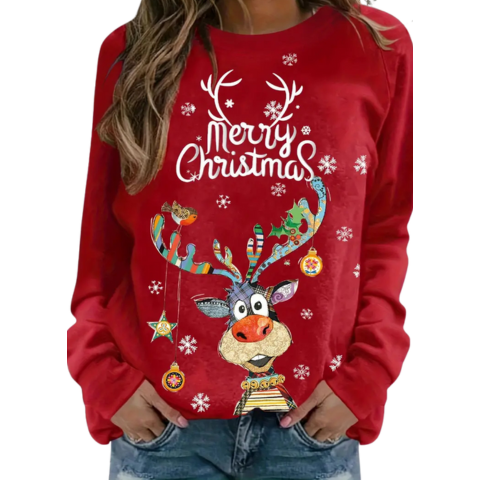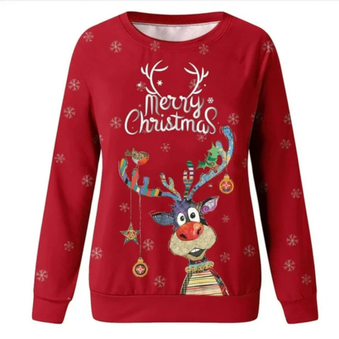 このセーターは、楽しくカラフルなスタイルで描かれたトナカイを強調しています。雪の結晶や装飾が、季節の温かい雰囲気を思い起こさせるビジュアルなタッチを加えています。日常的に着やすく、年末のすべての服装に遊び心をプラスします。